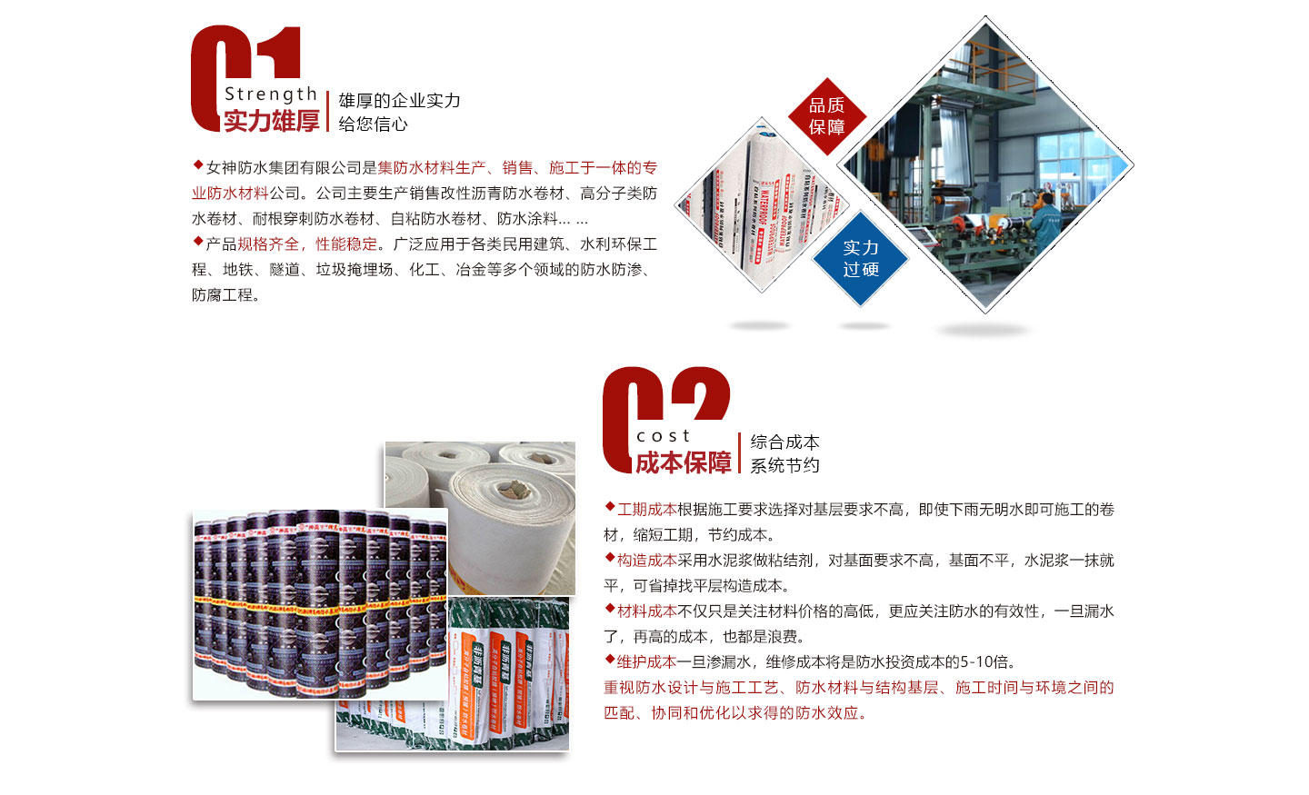 安徽女神建材科技集團(tuán)有限公司是集防水材料研發(fā)、生產(chǎn)、銷(xiāo)售、施工為一體的綜合性防水材料集團(tuán)公司。我公司旗下有多條大型一次成型生產(chǎn)線:SBS改性瀝青防水卷材,DTM聚酯復(fù)合高分子防水卷材,非瀝青基高分子防水卷材,PVC,TPO高分子防水卷材等生產(chǎn)線。我公司秉承“創(chuàng)新發(fā)展、實(shí)惠用戶”為宗旨,確保生產(chǎn)材料基礎(chǔ)上推出“共享生產(chǎn)廠家”,為開(kāi)發(fā)商、建筑商節(jié)約成本為理念,新理念受到用戶企業(yè)集采時(shí)一致好評(píng)和認(rèn)可。在互聯(lián)網(wǎng)時(shí)代,我公司將以互聯(lián)網(wǎng)“共享”為發(fā)展理念,為開(kāi)發(fā)商、建筑商、防水企業(yè)提供的產(chǎn)品,真正讓用戶企業(yè)達(dá)到巨大...
